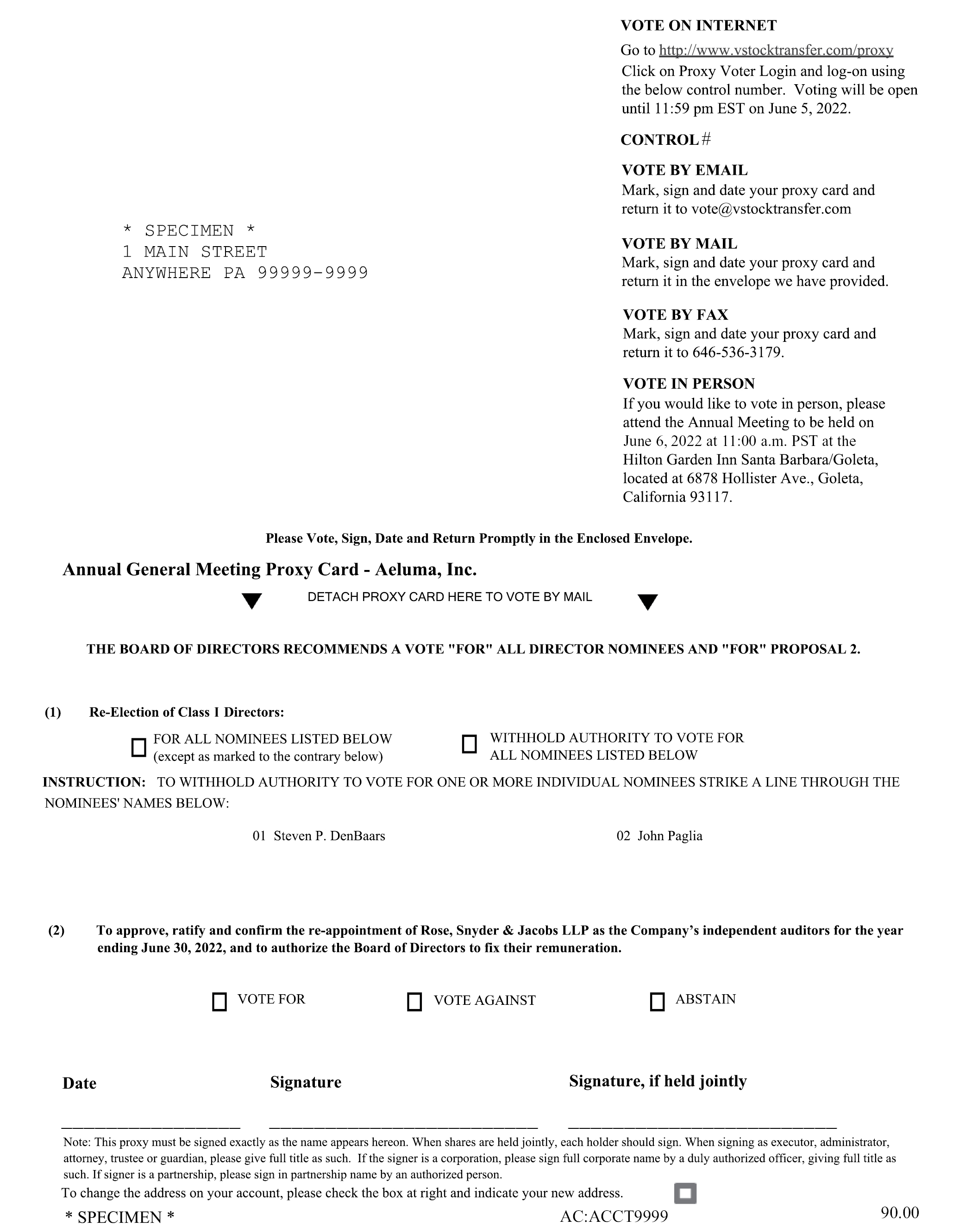 Whether or not you plan to attend the 2022 Annual Meeting, it is important that your shares be represented and voted at the 2022 Annual Meeting. Accordingly, after reading the Notice and accompanying proxy statement, please sign, date and mail the enclosed proxy card in the envelope provided or by email (vote@vstocktransfer.com), fax (646-536-3179) or online at www.vstocktransfer.com/proxy. The proxy card must be received by VStock Transfer, LLC no later than 11:59 p.m. EST on June 5, 2022 to be validly included in the tally of shares voted at the 2022 Annual Meeting. Detailed proxy voting instructions are provided both in the proxy statement and on the proxy card.