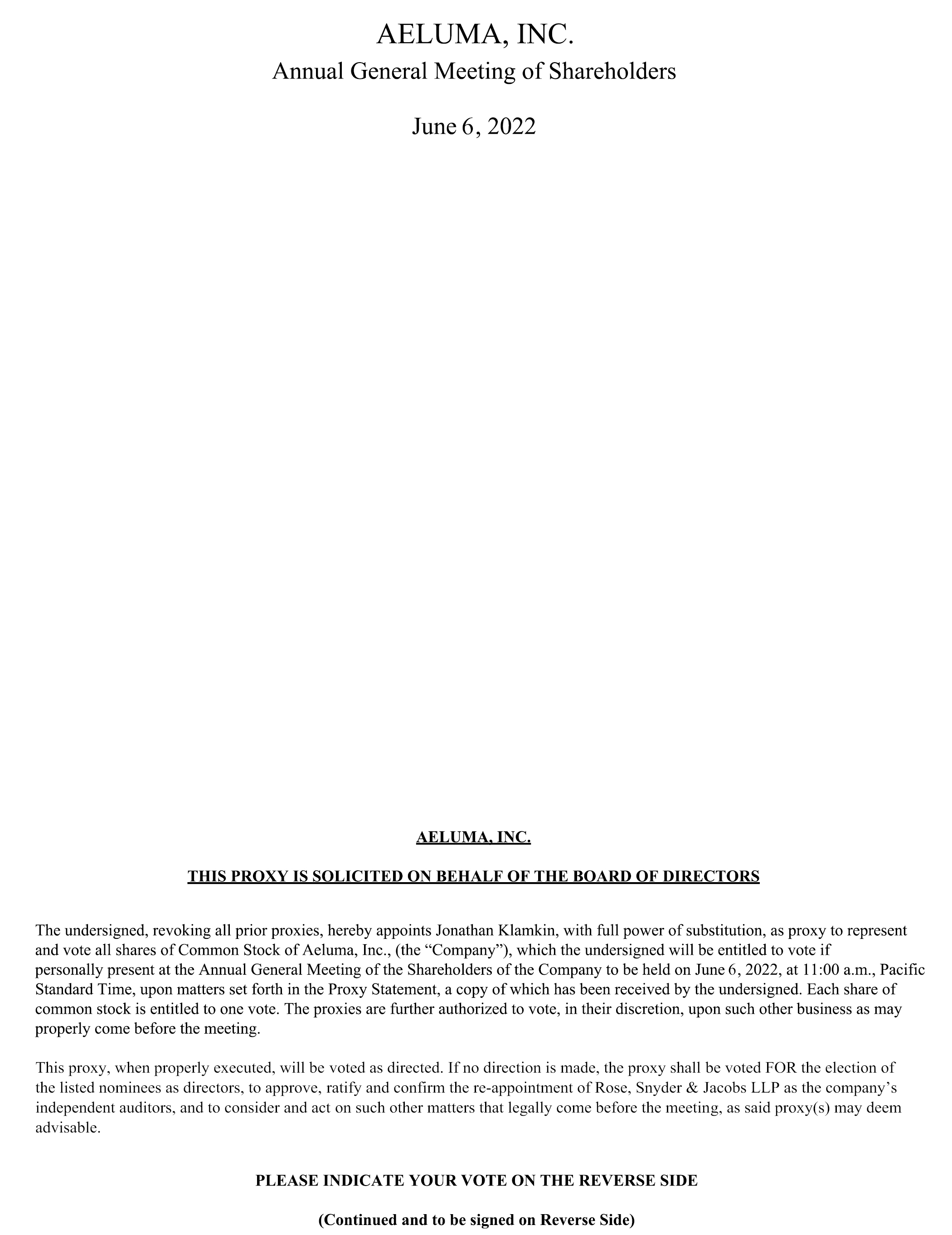 A proxy statement describing the matters to be voted upon at the 2022 Annual Meeting along with a proxy card enabling the shareholders to indicate their vote will be mailed on or about May 25, 2022, to all shareholders entitled to vote at the 2022 Annual Meeting. Such proxy statement will also be furnished to the U.S. Securities and Exchange Commission, or the SEC, in a Definitive Proxy Statement on Schedule 14A and will be available on our website at www.aeluma.com on or about May 25, 2022. If you plan to attend the 2022 Annual Meeting and your shares are not registered in your own name, please ask your broker, bank or other nominee that holds your shares to provide you with evidence of your share ownership. Such proof of share ownership will be required to gain admission to the 2022 Annual Meeting.
