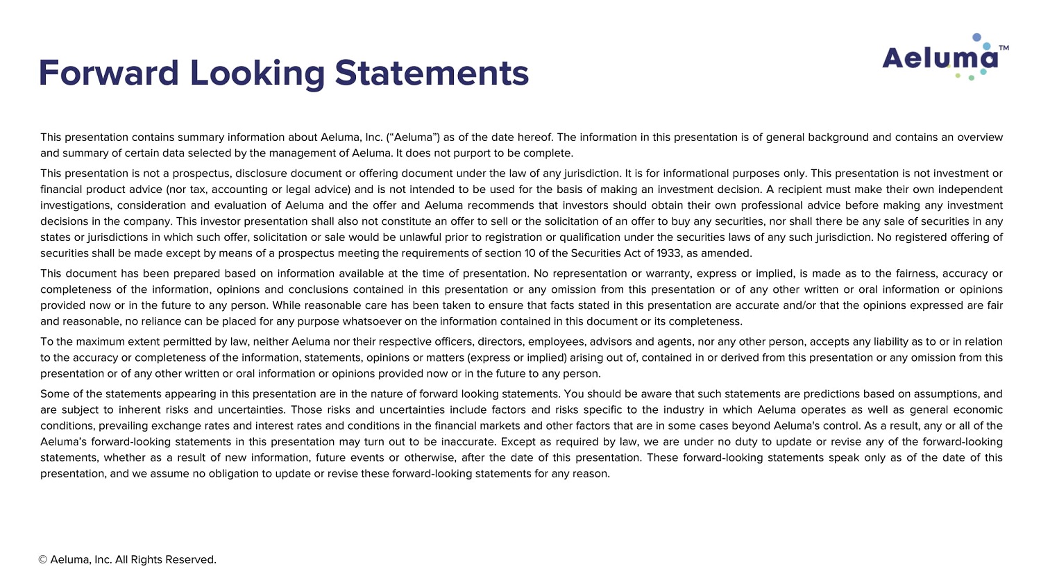 Forward Looking Statements This presentation contains summary information about Aeluma, Inc . (“Aeluma”) as of the date hereof . The information in this presentation is of general background and contains an overview and summary of certain data selected by the management of Aeluma . It does not purport to be complete . This presentation is not a prospectus, disclosure document or offering document under the law of any jurisdiction . It is for informational purposes only . This presentation is not investment or financial product advice (nor tax, accounting or legal advice) and is not intended to be used for the basis of making an investment decision . A recipient must make their own independent investigations, consideration and evaluation of Aeluma and the offer and Aeluma recommends that investors should obtain their own professional advice before making any investment decisions in the company . This investor presentation shall also not constitute an offer to sell or the solicitation of an offer to buy any securities, nor shall there be any sale of securities in any states or jurisdictions in which such offer, solicitation or sale would be unlawful prior to registration or qualification under the securities laws of any such jurisdiction . No registered offering of securities shall be made except by means of a prospectus meeting the requirements of section 10 of the Securities Act of 1933 , as amended . This document has been prepared based on information available at the time of presentation . No representation or warranty, express or implied, is made as to the fairness, accuracy or completeness of the information, opinions and conclusions contained in this presentation or any omission from this presentation or of any other written or oral information or opinions provided now or in the future to any person . While reasonable care has been taken to ensure that facts stated in this presentation are accurate and/or that the opinions expressed are fair and reasonable, no reliance can be placed for any purpose whatsoever on the information contained in this document or its completeness . To the maximum extent permitted by law, neither Aeluma nor their respective officers, directors, employees, advisors and agents, nor any other person, accepts any liability as to or in relation to the accuracy or completeness of the information, statements, opinions or matters (express or implied) arising out of, contained in or derived from this presentation or any omission from this presentation or of any other written or oral information or opinions provided now or in the future to any person . Some of the statements appearing in this presentation are in the nature of forward looking statements . You should be aware that such statements are predictions based on assumptions, and are subject to inherent risks and uncertainties . Those risks and uncertainties include factors and risks specific to the industry in which Aeluma operates as well as general economic conditions, prevailing exchange rates and interest rates and conditions in the financial markets and other factors that are in some cases beyond Aeluma's control . As a result, any or all of the Aeluma’s forward - looking statements in this presentation may turn out to be inaccurate . Except as required by law, we are under no duty to update or revise any of the forward - looking statements, whether as a result of new information, future events or otherwise, after the date of this presentation . These forward - looking statements speak only as of the date of this presentation, and we assume no obligation to update or revise these forward - looking statements for any reason . © Aeluma, Inc. All Rights Reserved.