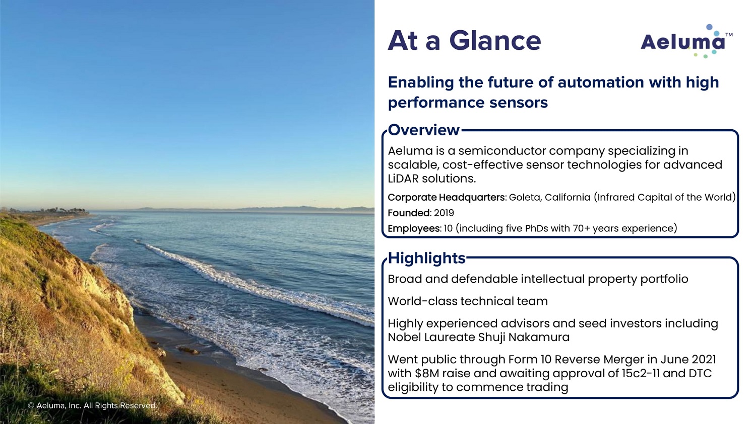 At a Glance Enabling the future of automation with high performance sensors Overview © Aeluma, Inc. All Rights Reserved. Aeluma is a semiconductor company specializing in scalable, cost - effective sensor technologies for advanced LiDAR solutions. Corporate Headquarters : Goleta, California (Infrared Capital of the World) Founded : 2019 Employees : 10 (including five PhDs with 70+ years experience) Highlights Broad and defendable intellectual property portfolio World - class technical team Highly experienced advisors and seed investors including Nobel Laureate Shuji Nakamura Went public through Form 10 Reverse Merger in June 2021 with $8M raise and awaiting approval of 15c2 - 11 and DTC eligibility to commence trading