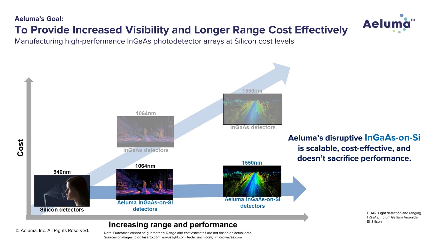 © Aeluma, Inc. All Rights Reserved. LiDAR: Light detection and ranging InGaAs: Indium Gallium Arsenide Si: Silicon Note: Outcomes cannot be guaranteed. Range and cost estimates are not based on actual data. Sources of images: blog.laserto.com; novuslight.com; techcrunch.com; i - microwaves.com Aeluma’s Goal: To Provide Increased Visibility and Longer Range Cost Effectively Manufacturing high - performance InGaAs photodetector arrays at Silicon cost levels Aeluma’s disruptive InGaAs - on - Si is scalable, cost - effective, and doesn’t sacrifice performance.
