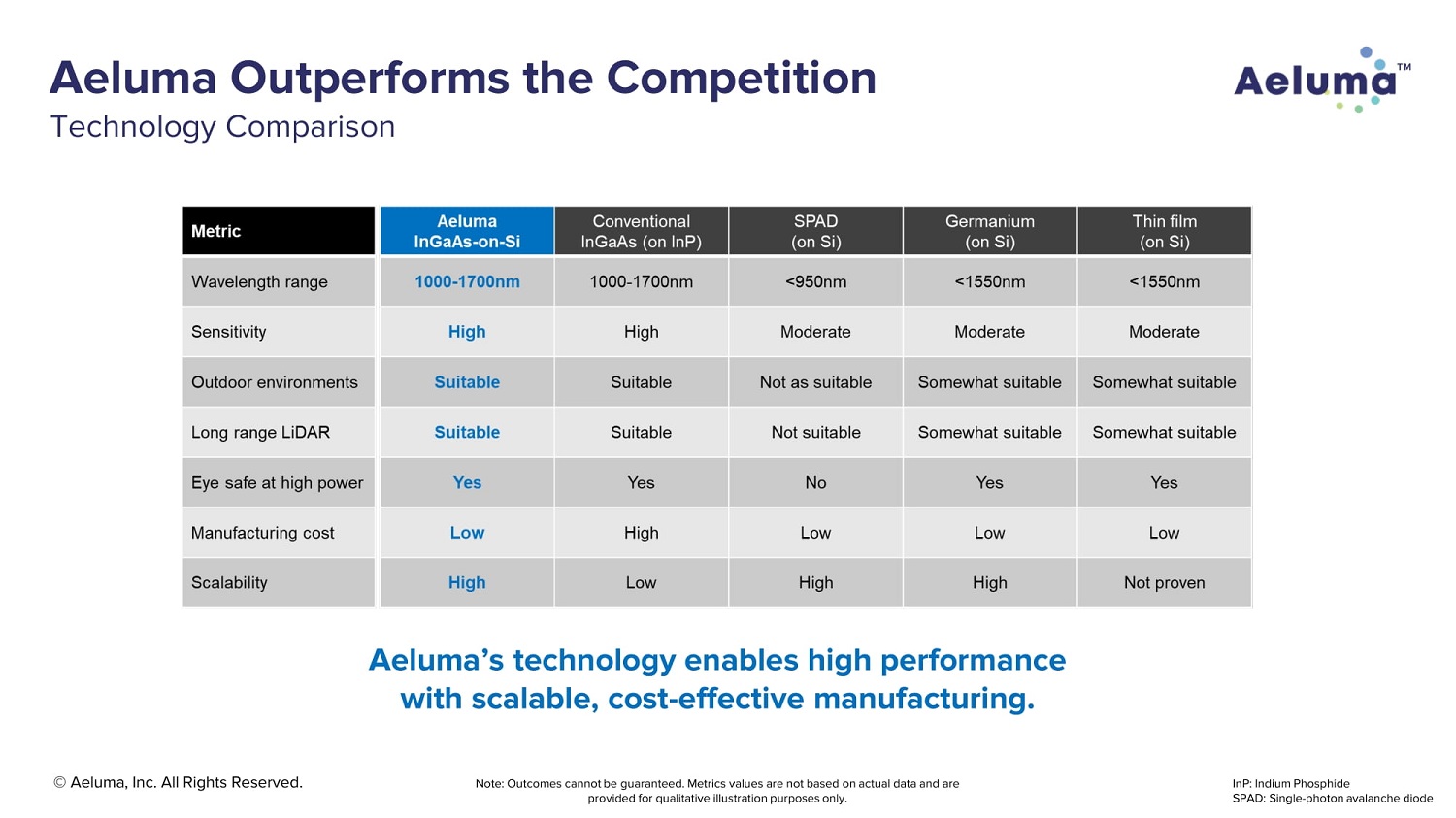 © Aeluma, Inc. All Rights Reserved. InP: Indium Phosphide SPAD: Single - photon avalanche diode Note: Outcomes cannot be guaranteed. Metrics values are not based on actual data and are provided for qualitative illustration purposes only. Aeluma Outperforms the Competition Technology Comparison Aeluma’s technology enables high performance with scalable, cost - effective manufacturing.