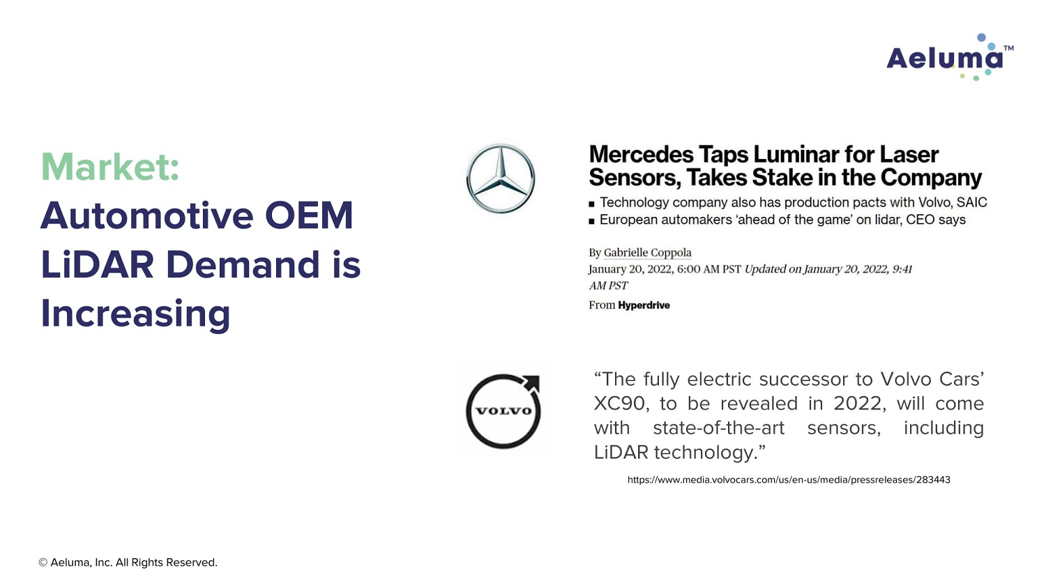 Market: Automotive OEM LiDAR Demand is Increasing “The fully electric successor to Volvo Cars’ XC 90 , to be revealed in 2022 , will come with state - of - the - art sensors, including LiDAR technology . ” https:// www.media.volvocars.com/us/en - us/media/pressreleases/283443 © Aeluma, Inc. All Rights Reserved.