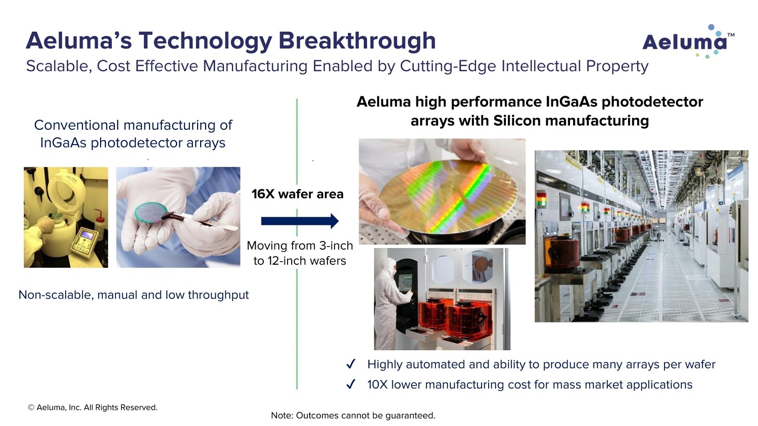 Conventional manufacturing of InGaAs photodetector arrays arrays with Silicon manufacturing ط Highly automated and ability to produce many arrays per wafer ط 10X lower manufacturing cost for mass market applications 16X wafer area Moving from 3 - inch to 12 - inch wafers Non - scalable, manual and low throughput Note: Outcomes cannot be guaranteed. © Aeluma, Inc. All Rights Reserved. Aeluma’s Technology Breakthrough Scalable, Cost Effective Manufacturing Enabled by Cutting - Edge Intellectual Property Aeluma high performance InGaAs photodetector