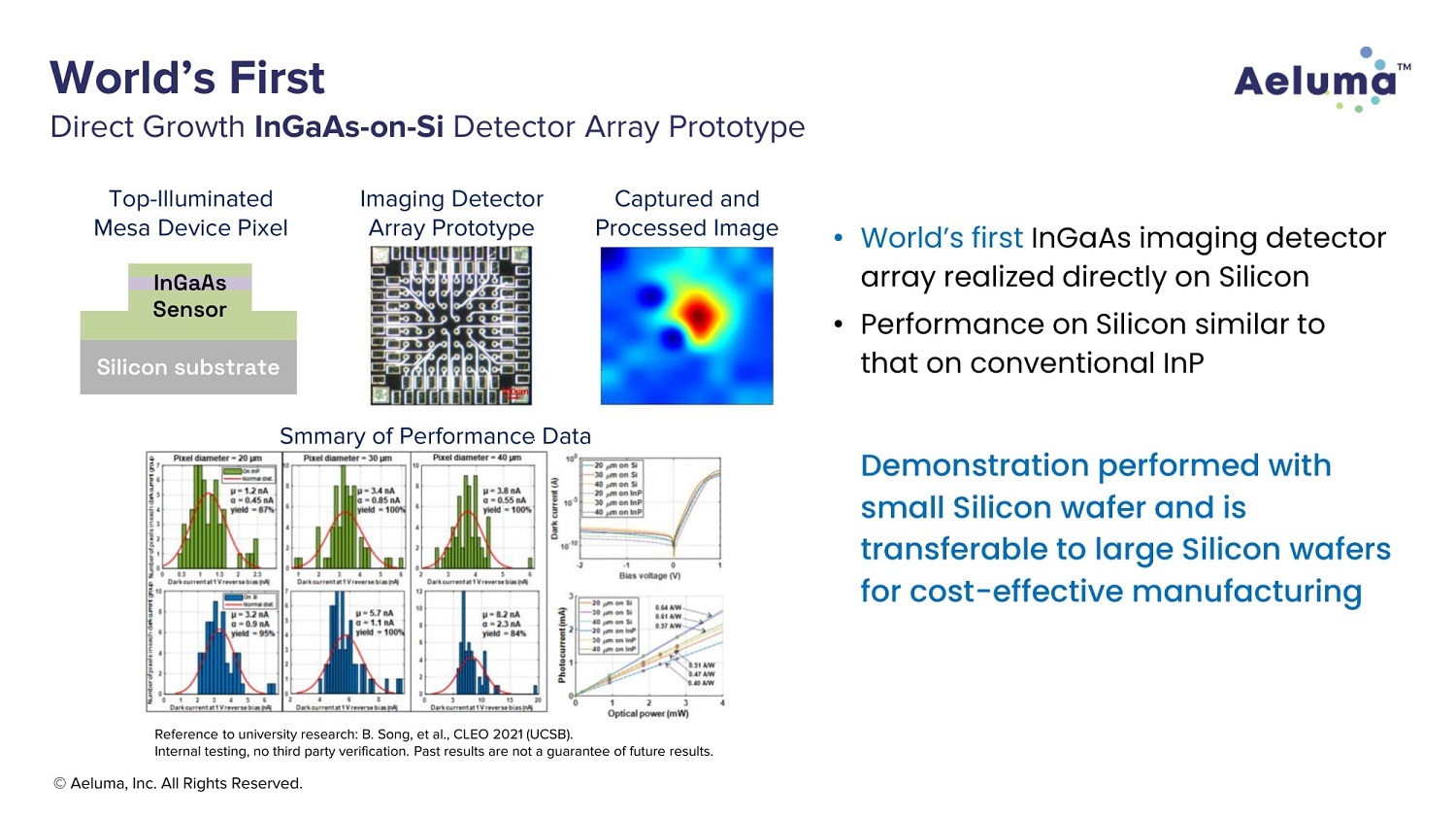 World’s First Direct Growth InGaAs - on - Si Detector Array Prototype Reference to university research: B. Song, et al., CLEO 2021 (UCSB). Internal testing, no third party verification. Past results are not a guarantee of future results. Top - Illuminated Mesa Device Pixel Imaging Detector Array Prototype Silicon substrate InGaAs Sensor Captured and Processed Image Smmary of Performance Data © Aeluma, Inc. All Rights Reserved. • World’s first InGaAs imaging detector array realized directly on Silicon • Performance on Silicon similar to that on conventional InP Demonstration performed with small Silicon wafer and is transferable to large Silicon wafers for cost - effective manufacturing
