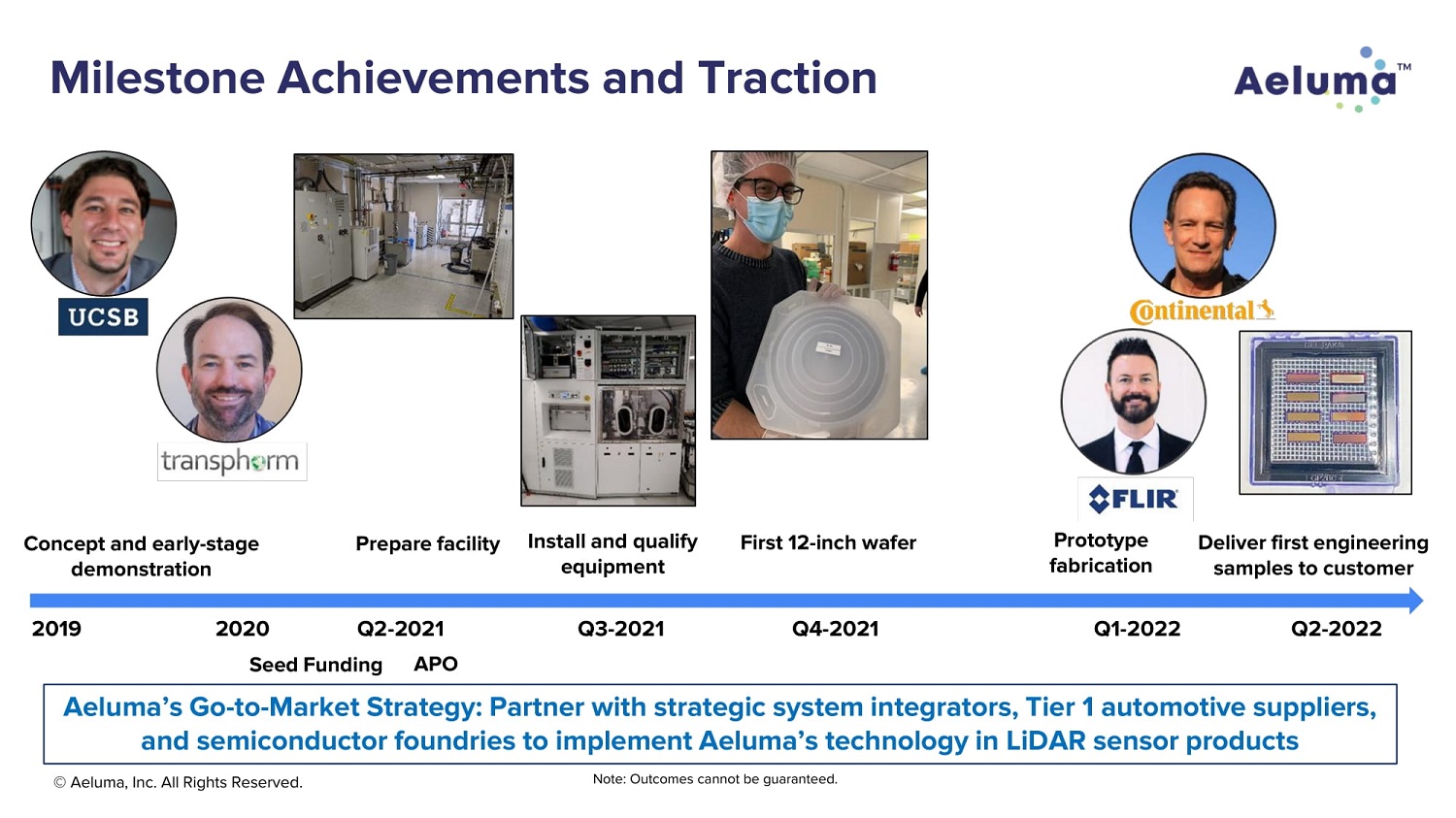 © Aeluma, Inc. All Rights Reserved. Aeluma’s Go - to - Market Strategy: Partner with strategic system integrators, Tier 1 automotive suppliers, and semiconductor foundries to implement Aeluma’s technology in LiDAR sensor products Note: Outcomes cannot be guaranteed. Milestone Achievements and Traction Prepare facility Install and qualify equipment First 12 - inch wafer Prototype fabrication Deliver first engineering samples to customer Concept and early - stage demonstration 2019 2020 Seed Funding APO Q2 - 2021 Q3 - 2021 Q4 - 2021 Q1 - 2022 Q2 - 2022