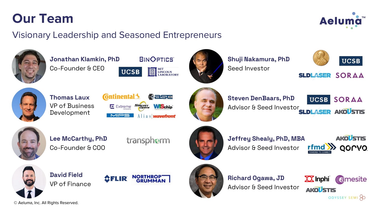 Our Team Visionary Leadership and Seasoned Entrepreneurs Jonathan Klamkin, PhD Co - Founder & CEO Thomas Laux VP of Business Development David Field VP of Finance Lee McCarthy, PhD Co - Founder & COO Steven DenBaars, PhD Advisor & Seed Investor Shuji Nakamura, PhD Seed Investor Jeffrey Shealy, PhD, MBA Advisor & Seed Investor Richard Ogawa, JD Advisor & Seed Investor © Aeluma, Inc. All Rights Reserved.