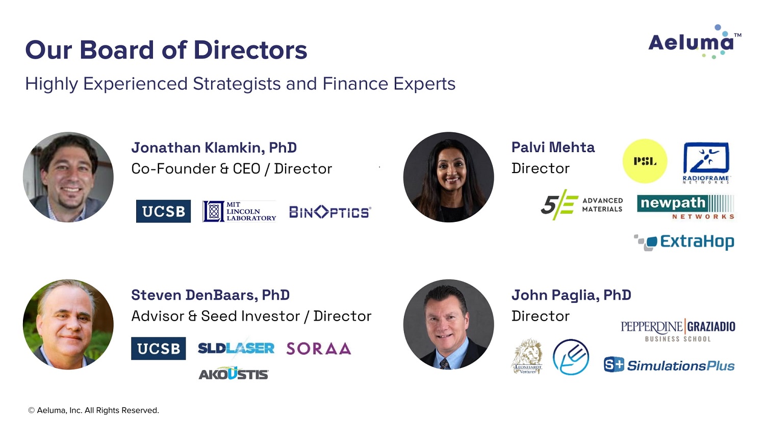 Our Board of Directors Highly Experienced Strategists and Finance Experts Steven DenBaars, PhD Advisor & Seed Investor / Director Palvi Mehta Director Jonathan Klamkin, PhD Co - Founder & CEO / Director John Paglia, PhD Director © Aeluma, Inc. All Rights Reserved.