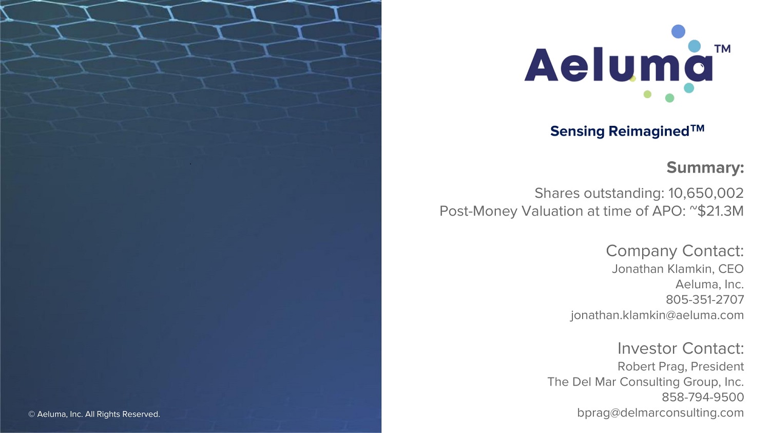 © Aeluma, Inc. All Rights Reserved. Sensing Reimagined TM Summary: Shares outstanding: 10,650,002 Post - Money Valuation at time of APO: ~$21.3M Company Contact: Jonathan Klamkin, CEO Aeluma, Inc. 805 - 351 - 2707 jonathan.klamkin@aeluma.com Investor Contact: Robert Prag, President The Del Mar Consulting Group, Inc. 858 - 794 - 9500 bprag@delmarconsulting.com
