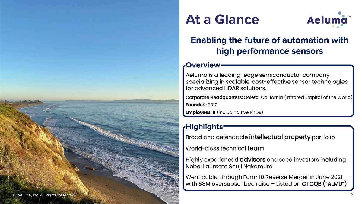 Forward Looking Statements Aeluma, Inc. All Rights Reserved. This presentation contains summary information about Aeluma, Inc . (“Aeluma”) as of the date hereof . The information in this presentation is of general background and contains an overview and summary of certain data selected by the management of Aeluma . It does not purport to be complete . This presentation is not a prospectus, disclosure document or offering document under the law of any jurisdiction . It is for informational purposes only . This presentation is not investment or financial product advice (nor tax, accounting or legal advice) and is not intended to be used for the basis of making an investment decision . A recipient must make their own independent investigations, consideration and evaluation of Aeluma and the offer and Aeluma recommends that investors should obtain their own professional advice before making any investment decisions in the company . This investor presentation shall also not constitute an offer to sell or the solicitation of an offer to buy any securities, nor shall there be any sale of securities in any states or jurisdictions in which such offer, solicitation or sale would be unlawful prior to registration or qualification under the securities laws of any such jurisdiction . No registered offering of securities shall be made except by means of a prospectus meeting the requirements of section 10 of the Securities Act of 1933 , as amended . This document has been prepared based on information available at the time of presentation . No representation or warranty, express or implied, is made as to the fairness, accuracy or completeness of the information, opinions and conclusions contained in this presentation or any omission from this presentation or of any other written or oral information or opinions provided now or in the future to any person . While reasonable care has been taken to ensure that facts stated in this presentation are accurate and/or that the opinions expressed are fair and reasonable, no reliance can be placed for any purpose whatsoever on the information contained in this document or its completeness . To the maximum extent permitted by law, neither Aeluma nor their respective officers, directors, employees, advisors and agents, nor any other person, accepts any liability as to or in relation to the accuracy or completeness of the information, statements, opinions or matters (express or implied) arising out of, contained in or derived from this presentation or any omission from this presentation or of any other written or oral information or opinions provided now or in the future to any person . Some of the statements appearing in this presentation are in the nature of forward looking statements . You should be aware that such statements are predictions based on assumptions, and are subject to inherent risks and uncertainties . Those risks and uncertainties include factors and risks specific to the industry in which Aeluma operates as well as general economic conditions, prevailing exchange rates and interest rates and conditions in the financial markets and other factors that are in some cases beyond Aeluma's control . As a result, any or all of the Aeluma’s forward - looking statements in this presentation may turn out to be inaccurate and actual results may be materially different than those expressed in such forward - looking statements . Except as required by law, we are under no duty to update or revise any of the forward - looking statements, whether as a result of new information, future events or otherwise, after the date of this presentation . These forward - looking statements speak only as of the date of this presentation, and we assume no obligation to update or revise these forward - looking statements for any reason . 2