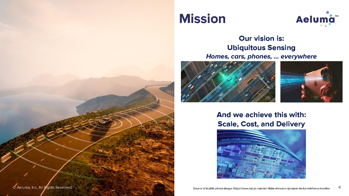 At a Glance © Aeluma, Inc. All Rights Reserved. Enabling the future of automation with high performance sensors Overvie w Aeluma is a leading - edge semiconductor company specializing in scalable, cost - effective sensor technologies for advanced LiDAR solutions. Corporate Headquarters : Goleta, California (Infrared Capital of the World) Founded : 2019 Employees : 11 (including five PhDs) Highlights Broad and defendable intellectual property portfolio World - class technical team Highly experienced advisors and seed investors including Nobel Laureate Shuji Nakamura Went public through Form 10 Reverse Merger in June 2021 with $8M oversubscribed raise – Listed on OTCQB (“ALMU”) 3