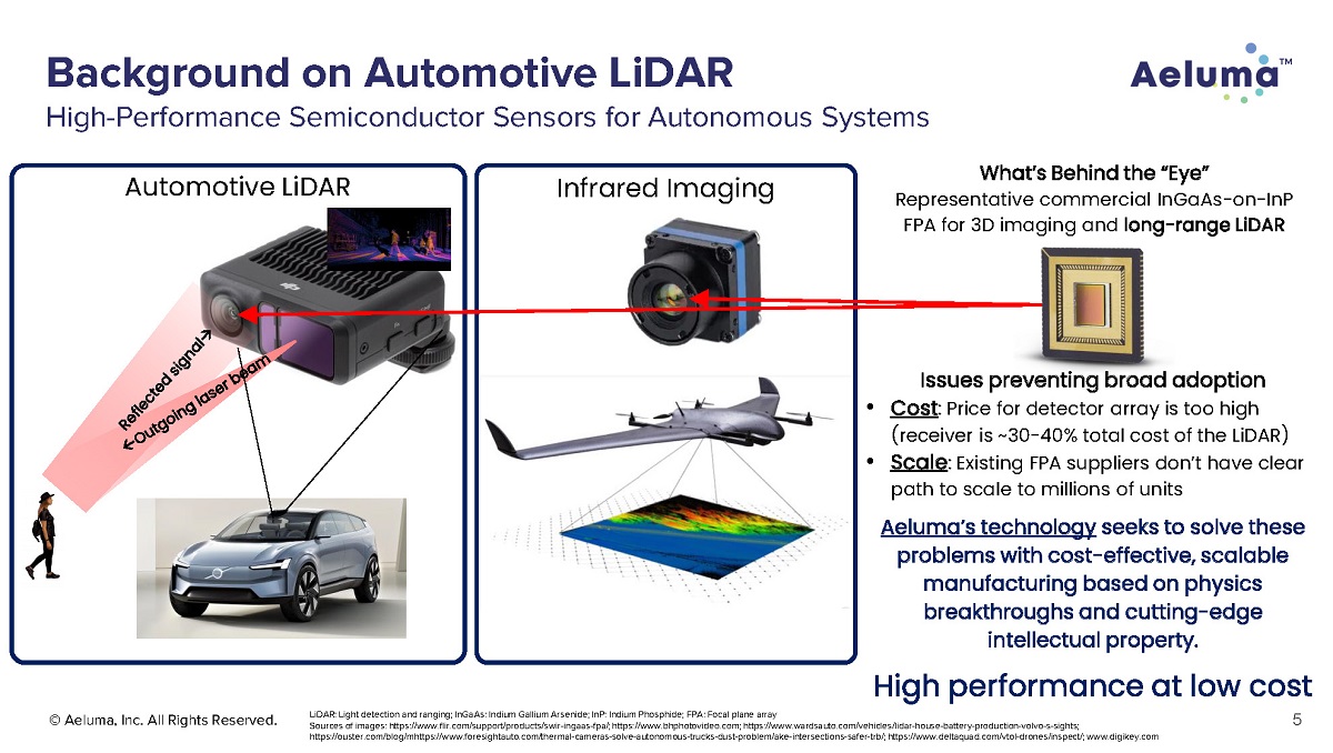 Our vision is: Ubiquitous Sensing Homes, cars, phones, … everywhere And we achieve this with: Scale, Cost, and Delivery Missio n © Aeluma, Inc. All Rights Reserved. Source of mobile phone image: https:// www.sacyr.com/en/ - /lidar - el - nuevo - ojo - laser - de - los - telefonos - moviles 4
