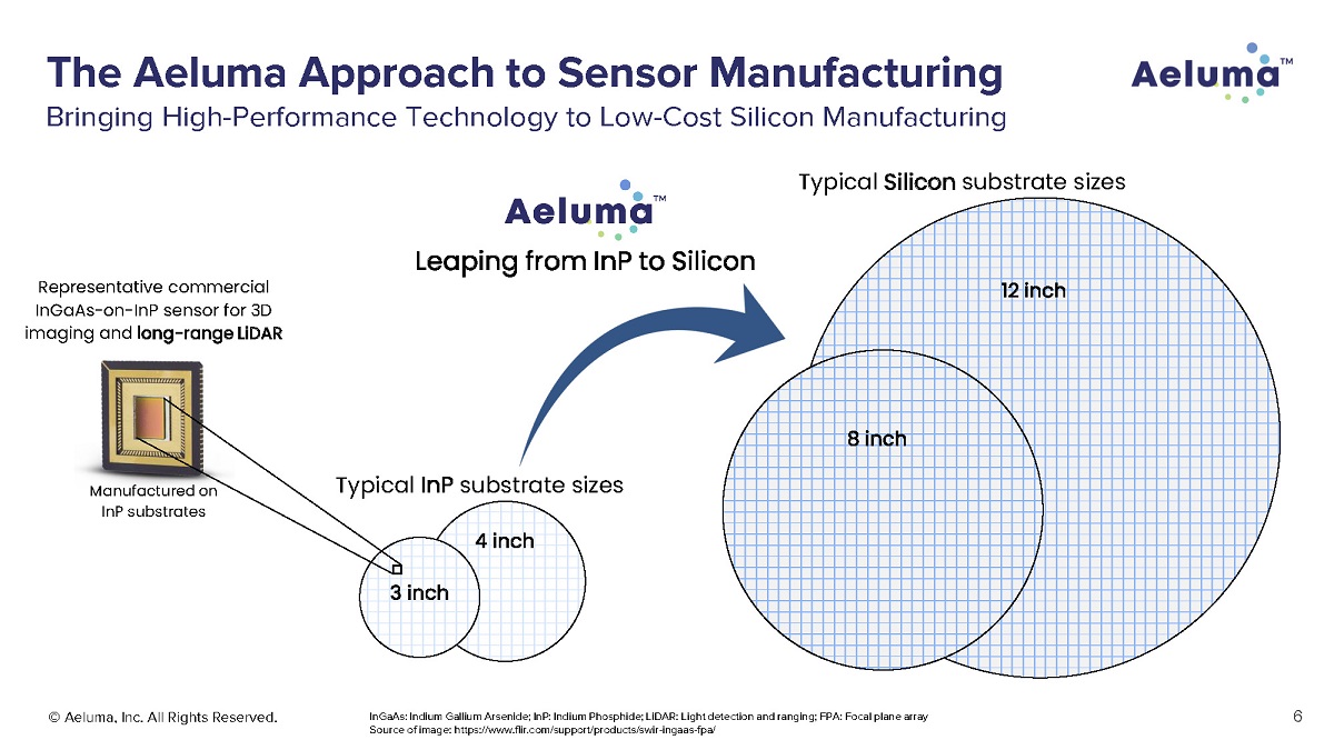 The Aeluma Approach to Sensor Manufacturing Bringing High - Performance Technology to Low - Cost Silicon Manufacturing © Aeluma, Inc. All Rights Reserved. 6 InGaAs: Indium Gallium Arsenide; InP: Indium Phosphide; LiDAR: Light detection and ranging; FPA: Focal plane array Source of image: https:// www.flir.com/support/products/swir - ingaas - fpa/ Typical InP substrate sizes Typical Silicon substrate sizes Leaping from InP to Silicon Representative commercial InGaAs - on - InP sensor for 3D imaging and long - range LiDAR Manufactured on InP substrates 4 inch 3 inch 8 inch 12 inch