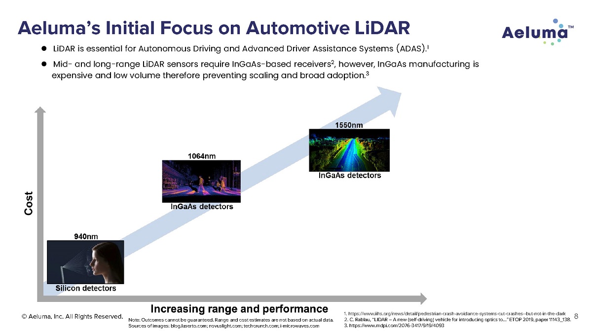 © Aeluma, Inc. All Rights Reserved. Aeluma’s Initial Focus on Automotive LiDAR ● LiDAR is essential for Autonomous Driving and Advanced Driver Assistance Systems (ADAS). 1 ● Mid - and long - range LiDAR sensors require InGaAs - based receivers 2 , however, InGaAs manufacturing is expensive and low volume therefore preventing scaling and broad adoption. 3 1. https:// www.iihs.org/news/detail/pedestrian - crash - avoidance - systems - cut - crashes - - but - not - in - the - dark Note: Outcomes cannot be guaranteed. Range and cost estimates are not based on actual data. 2. C. Rablau, “LIDAR – A new (self - driving) vehicle for introducing optics to...” ETOP 2019, paper 11143_138. Sources of images: blog.laserto.com; novuslight.com; techcrunch.com; i - microwaves.com 3. https:// www.mdpi.com/2076 - 3417/9/19/4093 8
