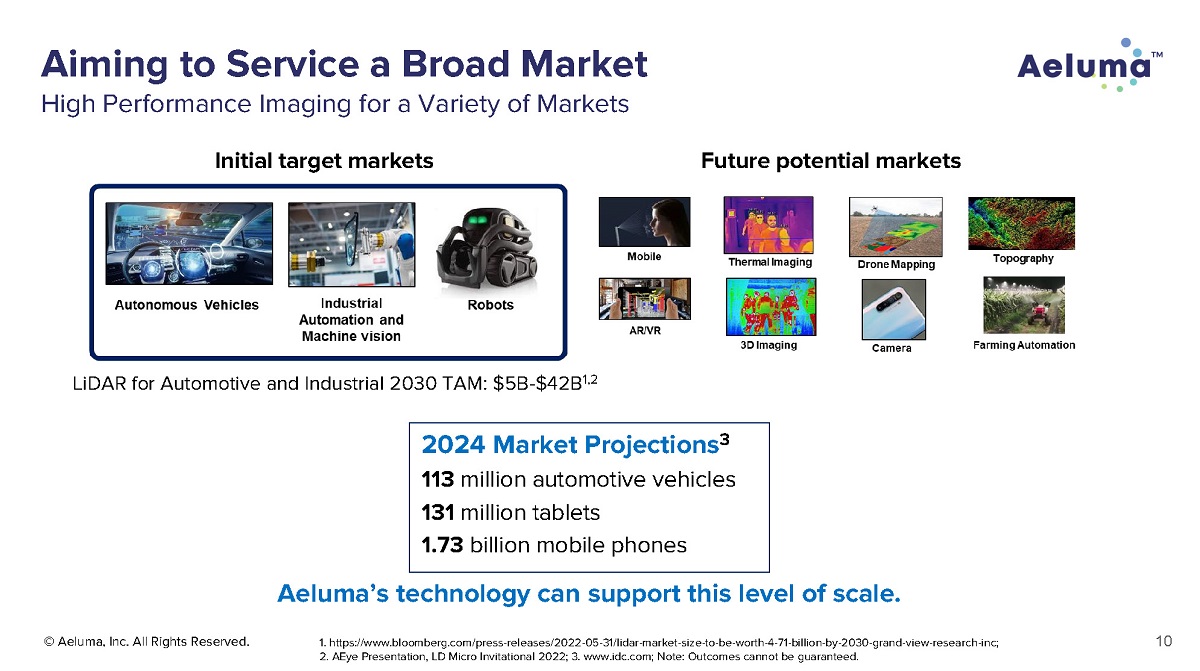 Si: Silicon Aeluma’s Goal: To Provide Increased Visibility and Longer Range Cost Effectively Manufacturing high - performance InGaAs photodetector arrays at Silicon cost levels Aeluma’s disruptive InGaAs - on - Si is scalable and cost - effective without sacrificing performance. © Aeluma, Inc. All Rights Reserved. Note: Outcomes cannot be guaranteed. Range and cost estimates are not based on actual data. Sources of images: blog.laserto.com; novuslight.com; techcrunch.com; i - microwaves.com 9