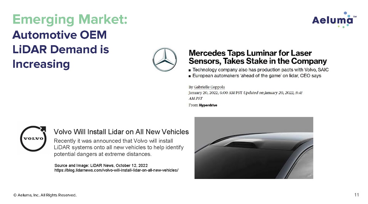 © Aeluma, Inc. All Rights Reserved. 11 Emerging Market: Automotive OEM LiDAR Demand is Increasing Volvo Will Install Lidar on All New Vehicles Recently it was announced that Volvo will install LiDAR systems onto all new vehicles to help identify potential dangers at extreme distances. Source and Image: LiDAR News, October 12, 2022 https://blog.lidarnews.com/volvo - will - install - lidar - on - all - new - vehicles/