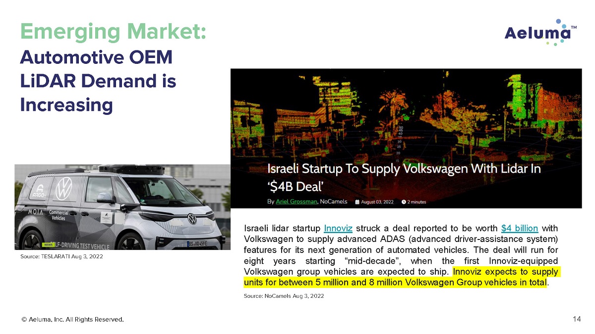 Emerging Market: Automotive OEM LiDAR Demand is Increasing © Aeluma, Inc. All Rights Reserved. Israeli lidar startup Innoviz struck a deal reported to be worth $ 4 billion with Volkswagen to supply advanced ADAS (advanced driver - assistance system) features for its next generation of automated vehicles . The deal will run for eight years starting “mid - decade”, when the first Innoviz - equipped Volkswagen group vehicles are expected to ship. Innoviz expects to supply units for between 5 million and 8 million Volkswagen Group vehicles in total . Source: TESLARATI Aug 3, 2022 Source: NoCamels Aug 3, 2022 14