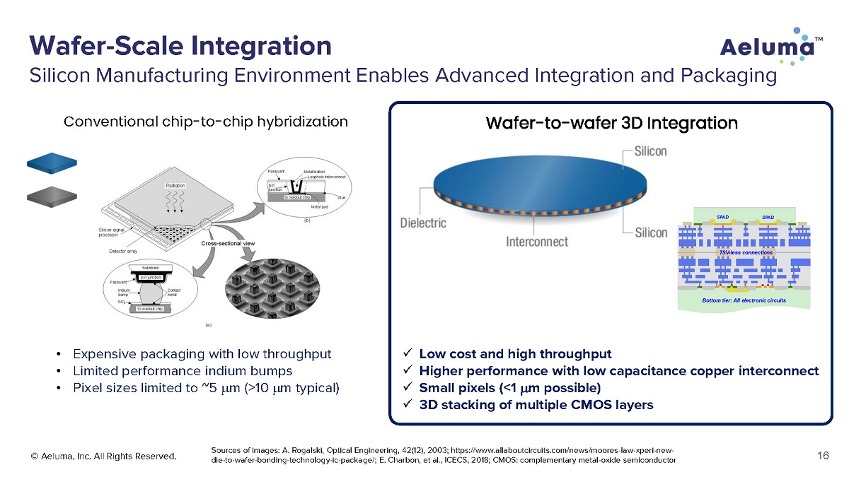 Manufacturing for a Mass Market © Aeluma, Inc. All Rights Reserved. 15 Aeluma’s Large - Diameter Silicon Manufacturing Economies of Scale Cars will have Radar, LiDAR, and Camera sensors Note: Outcomes cannot be guaranteed. Values are provided for qualitative illustration purposes only. 1 www.idc.com. Source of car/sensors figure: https:// www.eetimes.com/why - sensor - technology - is - the - key - to - autonomous - vehicles/ • Market: 113 million automotive vehicles in 2024 1 • Each vehicle may have 1 - 5 LiDAR sensors • Note: Some LiDARs require more than 1 FPA Number of wafers required 3 inch: 106,383 wafers 4 inch: 53,192 3 inch: 47 chips per wafer 4 inch: 94 chips per wafer Example case: Manufacturing 5,000,000 FPA units Number of wafers required 8 - inch: 10,706 wafers 12 - inch: 4,425 8 - inch: 467 chips per wafer 12 - inch: 1,130 chips per wafer Aeluma’s manufacturing approach can enable the scaling and cost reduction required for mass market applications.