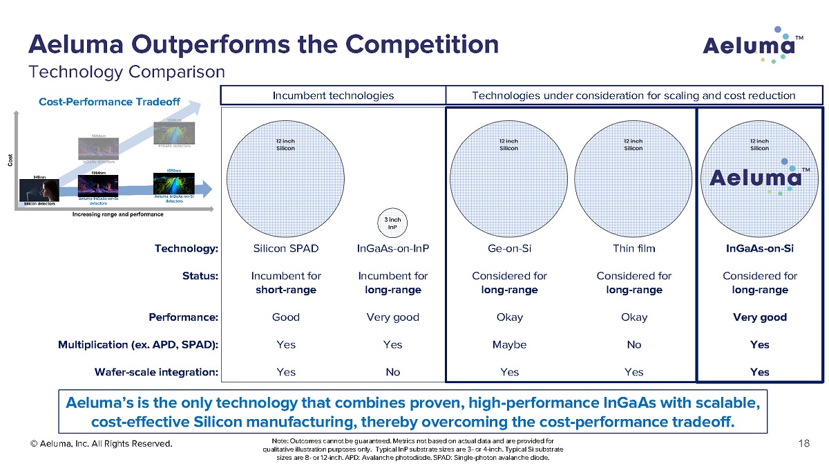 © Aeluma, Inc. All Rights Reserved. Note: Outcomes cannot be guaranteed. Metrics not based on actual data and are provided for qualitative illustration purposes only. Typical InP substrate sizes are 3 - or 4 - inch. Typical Si substrate sizes are 8 - or 12 - inch. APD: Avalanche photodiode. SPAD: Single - photon avalanche diode. Aeluma Outperforms the Competition Technology Comparison Aeluma’s is the only technology that combines proven, high - performance InGaAs with scalable, cost - effective Silicon manufacturing, thereby overcoming the cost - performance tradeoff. Technology: Status: Performanc e: Multiplication (ex. APD, SPAD): Wafer - scale integration: Incumbent technologies Technologies under consideration for scaling and cost reduction Silicon SPAD InGaAs - on - InP Ge - on - Si Thin film InGaAs - on - Si Incumbent for short - range Incumbent for long - range Considered for long - range Considered for long - range Considered for long - range Good Very good Okay Okay Very good Yes Yes Maybe No Yes Yes No Yes Yes Yes 18 Cost - Performance Tradeoff