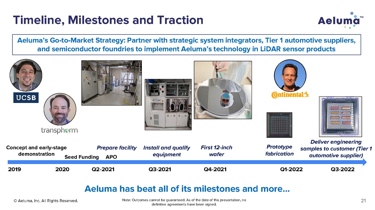 © Aeluma, Inc. All Rights Reserved. Aeluma’s Go - to - Market Strategy: Partner with strategic system integrators, Tier 1 automotive suppliers, and semiconductor foundries to implement Aeluma’s technology in LiDAR sensor products Aeluma has beat all of its milestones and more… Note: Outcomes cannot be guaranteed. As of the date of this presentation, no Timeline, Milestones and Traction Prepare facility Install and qualify equipment First 12 - inch wafer Prototype fabrication Concept and early - stage demonstratio n 201 9 Q3 - 2022 Seed Funding APO 2020 Q2 - 2021 Q3 - 2021 Q4 - 2021 Q1 - 2022 Deliver engineering samples to customer (Tier 1 automotive supplier) 21