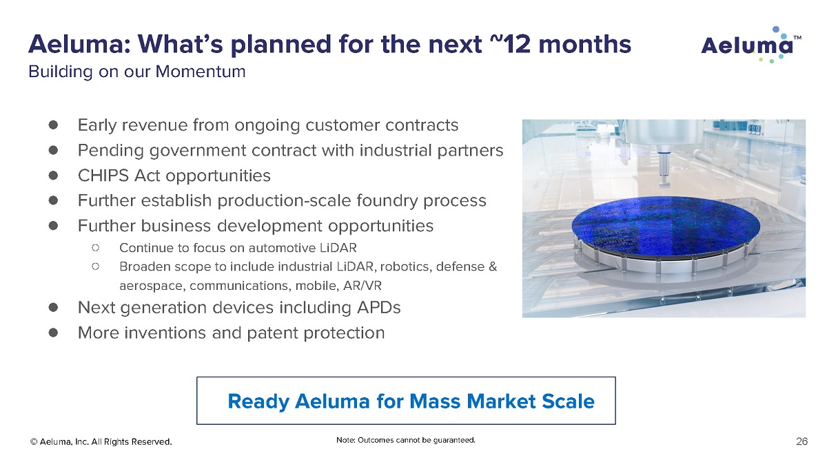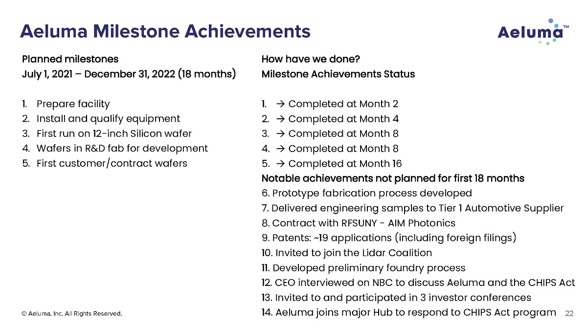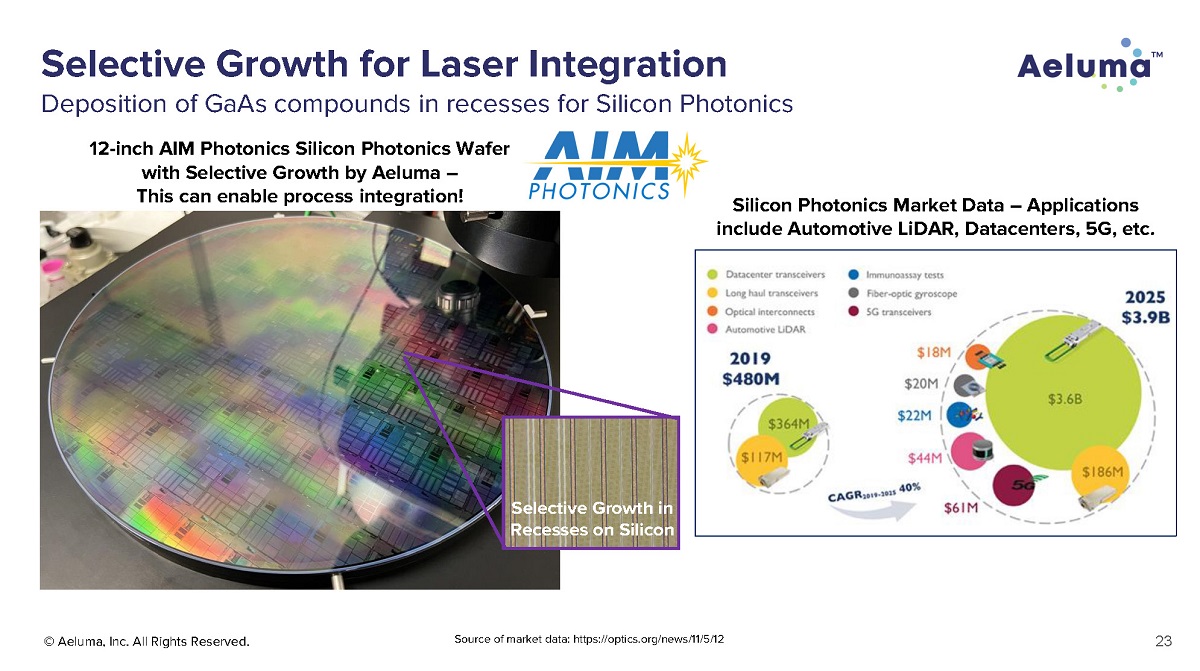 © Aeluma, Inc. All Rights Reserved. Aeluma Milestone Achievements Planned milestones July 1, 2021 – December 31, 2022 (18 months) 1. Prepare facility 2. Install and qualify equipment 3. First run on 12 - inch Silicon wafer 4. Wafers in R&D fab for development 5. First customer/contract wafers How have we done? Milestone Achievements Status 1. Completed at Month 2 2. Completed at Month 4 3. Completed at Month 8 4. Completed at Month 8 5. Completed at Month 16 Notable achievements not planned for first 18 months 6. Prototype fabrication process developed 7. Delivered engineering samples to Tier 1 Automotive Supplier 8. Contract with RFSUNY - AIM Photonics 9. Patents: ~19 applications (including foreign filings) 10. Invited to join the Lidar Coalition 11. Developed preliminary foundry process 12. CEO interviewed on NBC to discuss Aeluma and the CHIPS Act 13. Invited to and participated in 3 investor conferences 14. Aeluma joins major Hub to respond to CHIPS Act program 22