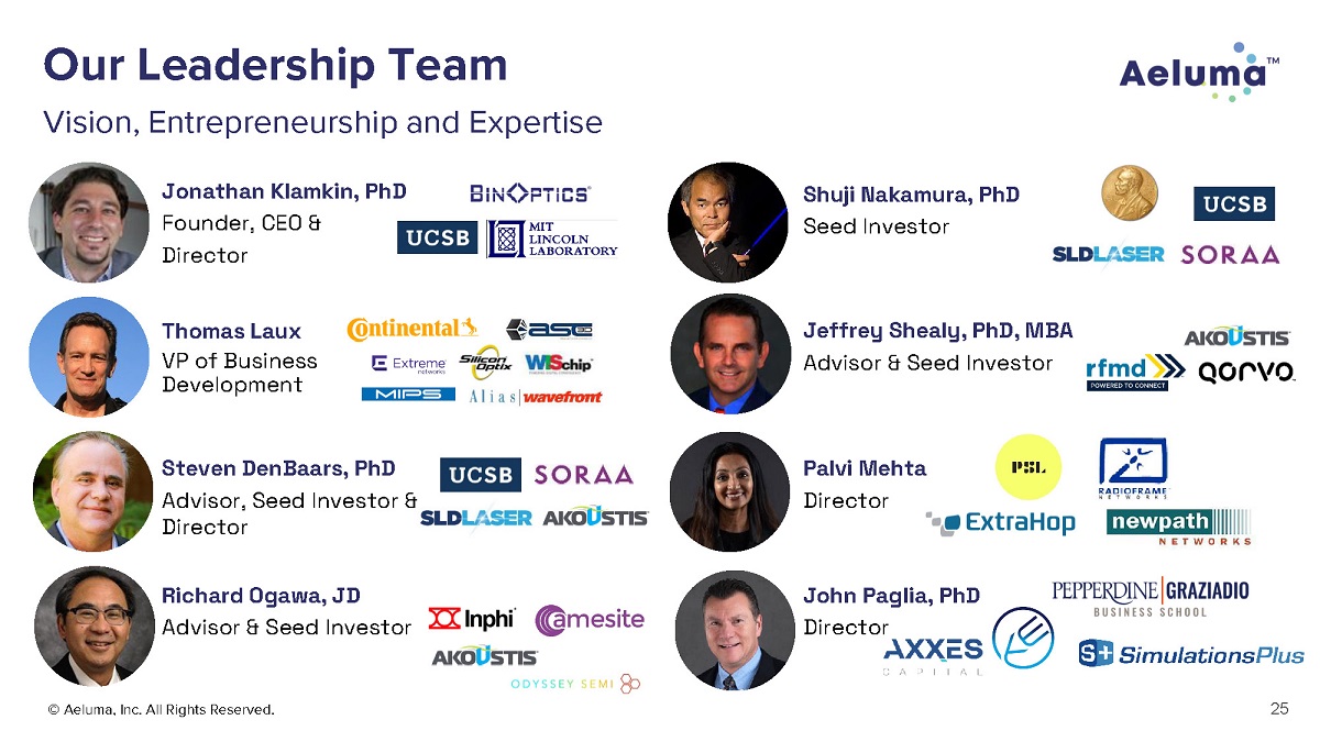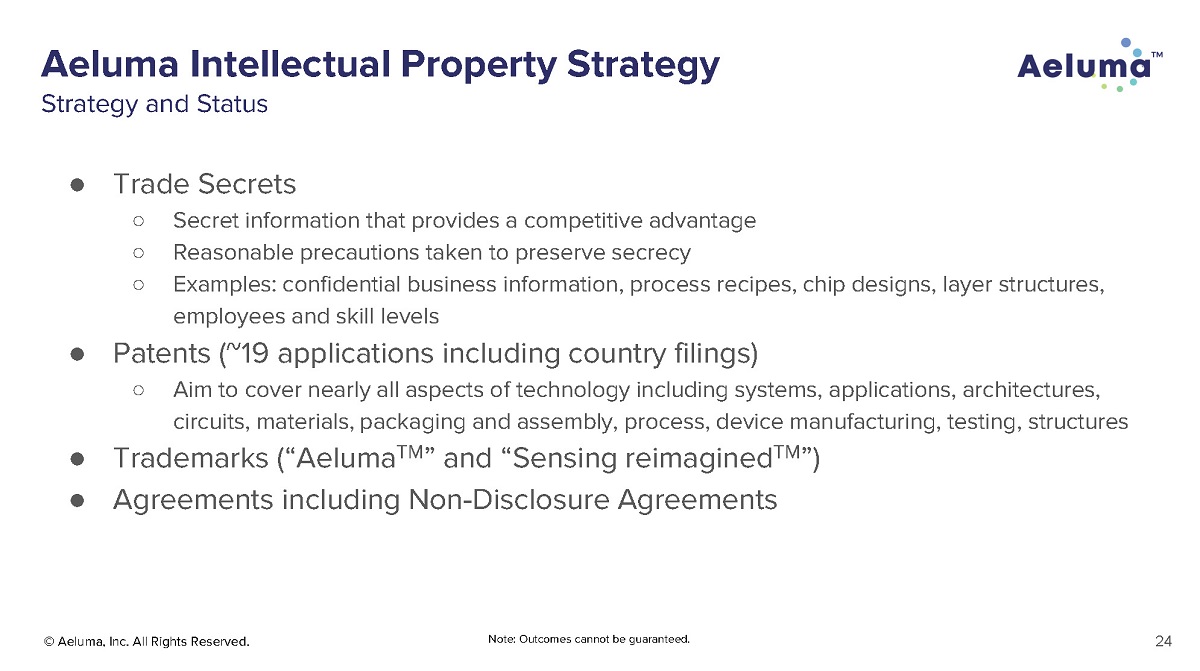 © Aeluma, Inc. All Rights Reserved. Aeluma Intellectual Property Strategy Strategy and Status ● Trade Secrets ○ Secret information that provides a competitive advantage ○ Reasonable precautions taken to preserve secrecy ○ Examples: confidential business information, process recipes, chip designs, layer structures, employees and skill levels ● Patents (~19 applications including country filings) ○ Aim to cover nearly all aspects of technology including systems, applications, architectures, circuits, materials, packaging and assembly, process, device manufacturing, testing, structures ● Trademarks (“Aeluma TM ” and “Sensing reimagined TM ”) ● Agreements including Non - Disclosure Agreements Note: Outcomes cannot be guaranteed. 24