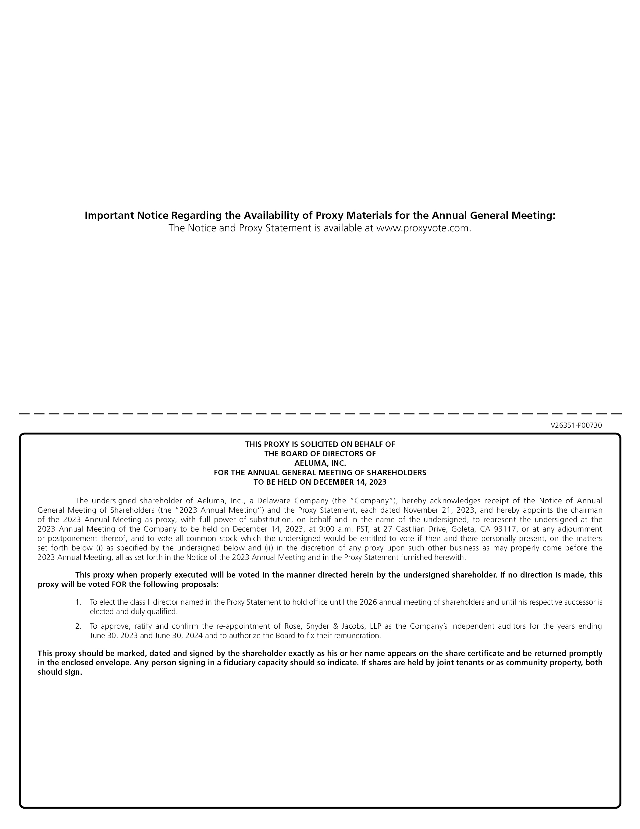 A proxy statement describing the matters to be voted upon at the 2023 Annual Meeting along with a proxy card enabling the shareholders to indicate their vote will be mailed on or about November 21, 2023, to all shareholders entitled to vote at the 2023 Annual Meeting. Such proxy statement will also be furnished to the U.S. Securities and Exchange Commission, or the SEC, in a Definitive Proxy Statement on Schedule 14A and will be available on our website at www.aeluma.com on or about November 21, 2023. If you plan to attend the 2023 Annual Meeting and your shares are not registered in your own name, please ask your broker, bank or other nominee that holds your shares to provide you with evidence of your share ownership. Such proof of share ownership will be required to gain admission to the 2023 Annual Meeting.