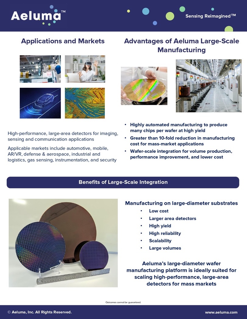 Sensing R e i m agin e d TM Applications and Markets Advantages of Aeluma Large - Scale Manufacturing • H i g hly aut o m a ted m a nuf acturing to pr o d uce m a ny chi p s p er wafer at high yi e ld • Greater than 10 - fold reduction in manufacturing c ost f o r m a s s - m a rket a pp l i cat i o ns • Wafer - sc al e integrati o n f o r v o lu m e p r o d uct i o n, performance improvement, and lower cost B e n efi t s of Large - S c a l e In t egra t i on High - performance, large - area detectors for imaging, sensing and communication applications Applicable markets include automotive, mobile, AR / VR , d e f ens e & a er o s pa c e, i n d u s t ri a l a nd logistics, gas sensing, instrumentation, and security Outcomes cannot be guaranteed. Ma nu fact u ri n g on l a r g e - d i a m eter su b s t rates • L o w c ost • Larger area detectors • H i g h y i e l d • High reliability • Scalability • L ar g e v o lu m es Aeluma’s large - diameter wafer manufacturing platform is ideally suited for sca l i ng h i g h - perf o rm a nce, l a r g e - a rea de t ecto r s f o r mas s ma rke t s © Aeluma, Inc. All Rights Reserved. www.aeluma.com
