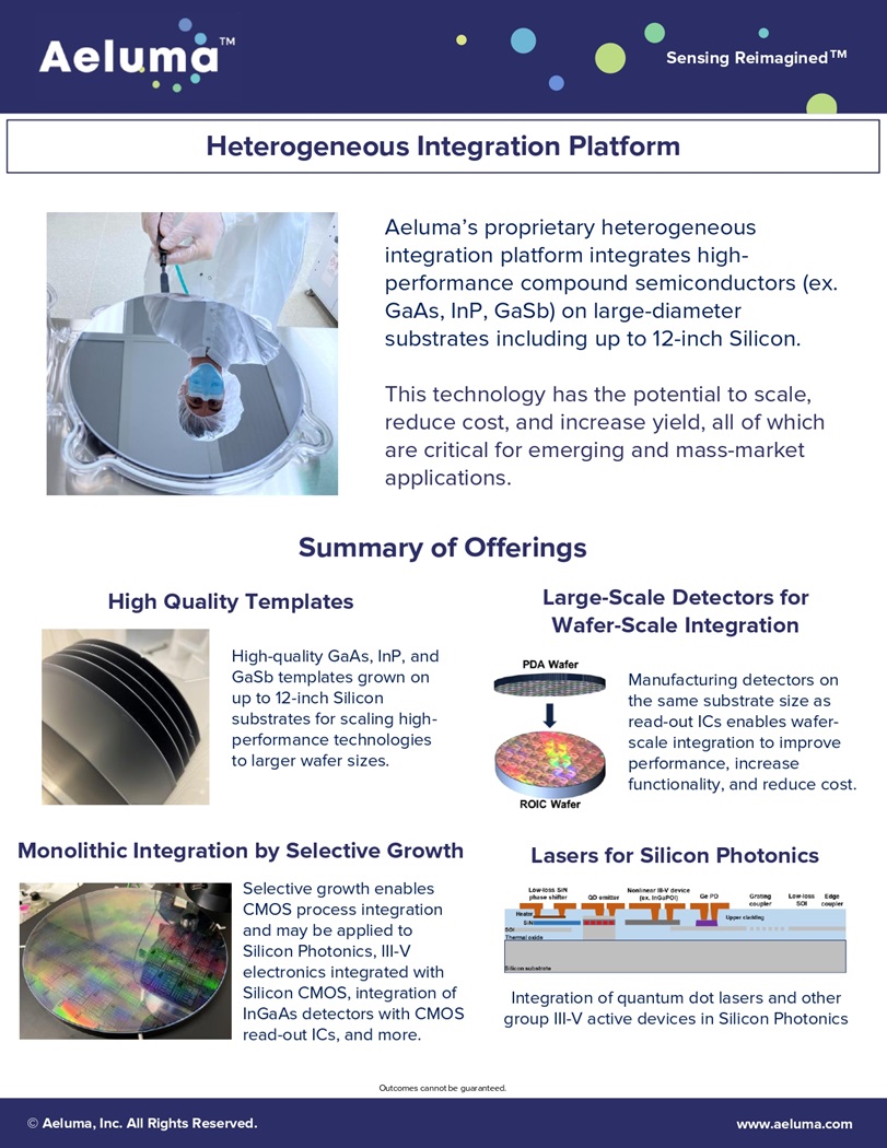 Sensing Reimagined TM Heterogeneous Integration Platform Aeluma’s proprietary heterogeneous integration platform integrates high - performance compound semiconductors (ex. GaAs, InP, GaSb) on large - diameter substrates including up to 12 - inch Silicon. This technology has the potential to scale, reduce cost, and increase yield, all of which are critical for emerging and mass - market applications. Summary of Offerings High Quality Templates Large - Scale Detectors for Wafer - Scale Integration Monolithic Integration by Selective Growth Selective growth enables CMOS process integration and may be applied to Silicon Photonics, III - V electronics integrated with Silicon CMOS, integration of InGaAs detectors with CMOS read - out ICs, and more. Lasers for Silicon Photonics Integration of quantum dot lasers and other group III - V active devices in Silicon Photonics Outcomes cannot be guaranteed. © Aeluma, Inc. All Rights Reserved. www.aeluma.com Manufacturing detectors on the same substrate size as read - out ICs enables wafer - scale integration to improve performance, increase functionality, and reduce cost. High - quality GaAs, InP, and GaSb templates grown on up to 12 - inch Silicon substrates for scaling high - performance technologies to larger wafer sizes.