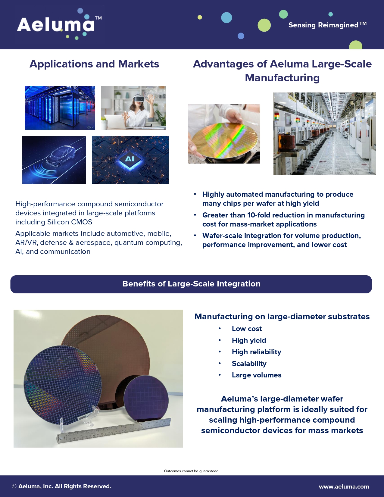Sensing Reimagined TM Applications and Markets Advantages of Aeluma Large - Scale Manufacturing • Highly automated manufacturing to produce many chips per wafer at high yield • Greater than 10 - fold reduction in manufacturing cost for mass - market applications • Wafer - scale integration for volume production, performance improvement, and lower cost High - performance compound semiconductor devices integrated in large - scale platforms including Silicon CMOS Applicable markets include automotive, mobile, AR/VR, defense & aerospace, quantum computing, AI, and communication Manufacturing on large - diameter substrates • Low cost • High yield • High reliability • Scalability • Large volumes Aeluma’s large - diameter wafer manufacturing platform is ideally suited for scaling high - performance compound semiconductor devices for mass markets Benefits of Large - Scale Integration Outcomes cannot be guaranteed. © Aeluma, Inc. All Rights Reserved. www.aeluma.com