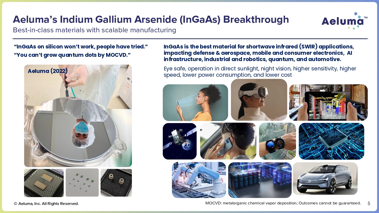 Background Story: Gallium Nitride (GaN) and the Blue LED A materials breakthrough that enabled an industry and more 4 LED: light emitting diode; www.energy.gov/energysaver/led - lighting https:// www.youtube.com/watch?v=AF8d72mA41M&t=1399s The blue LED revolutionized lighting and displays, and gallium nitride broadly impacted many photonics and electronics applications. LEDs use 75% less energy and last 25 times longer Energy savings by 2035 of 569 TWh (92 1,000 MW power plants) “These won’t ever replace the kitchen light.” “The research is a waste of money.” Why it was Almost Impossible to Make the Blue LED Shuji Nakamura – UCSB Professor, Nobel Laureate, Aeluma Investor © Aeluma, Inc. All Rights Reserved.