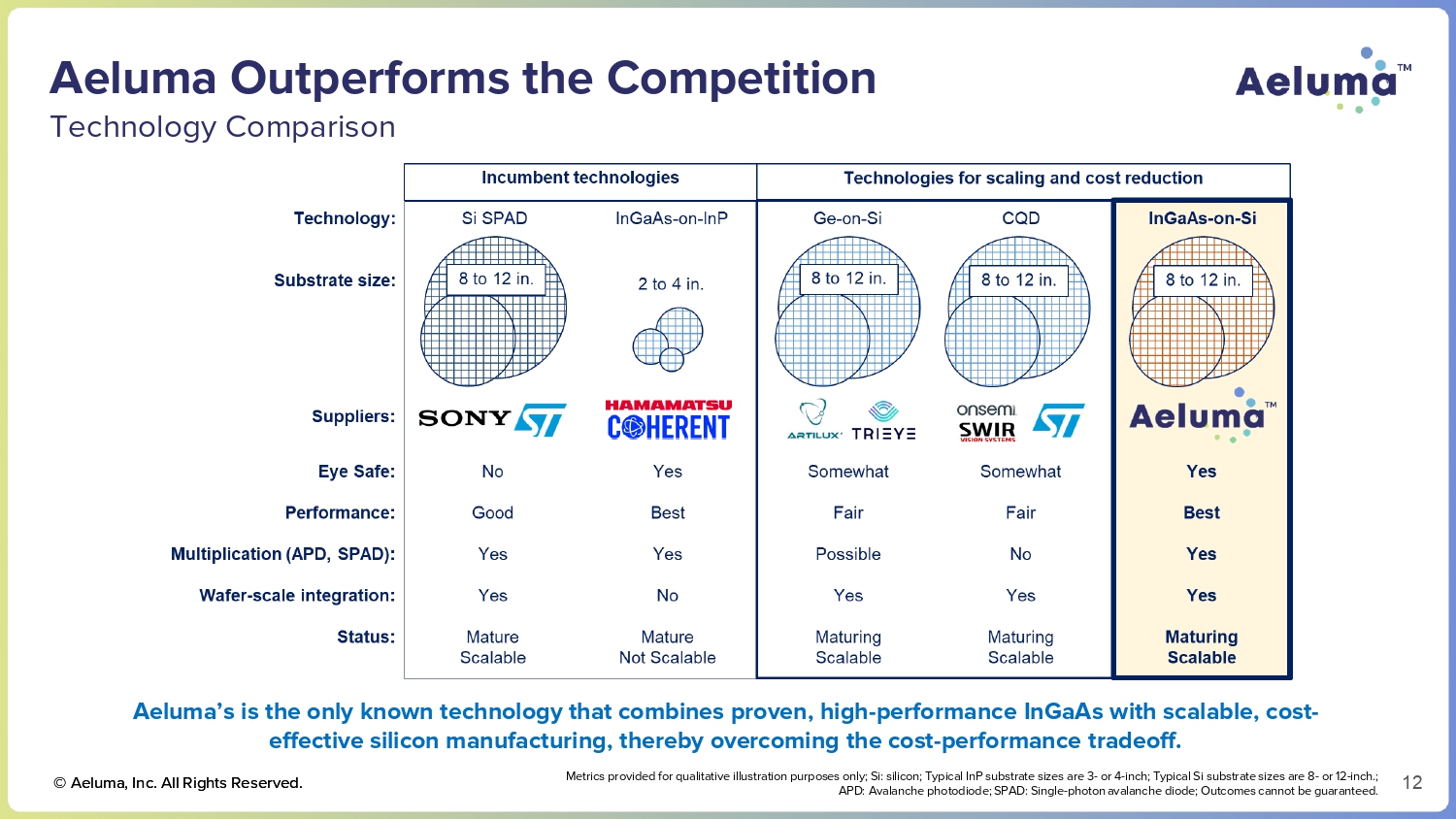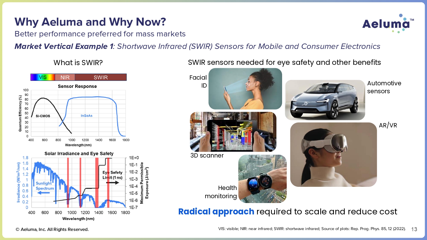 APD: Avalanche photodiode; SPAD: Single - photon avalanche diode; Outcomes cannot be guaranteed. Aeluma Outperforms the Competition Technology Comparison Aeluma’s is the only known technology that combines proven, high - performance InGaAs with scalable, cost - effective silicon manufacturing, thereby overcoming the cost - performance tradeoff. Metrics provided for qualitative illustration purposes only; Si: silicon; Typical InP substrate sizes are 3 - or 4 - inch; Typical Si substrate sizes are 8 - or 12 - inch.; 12 © Aeluma, Inc. All Rights Reserved.
