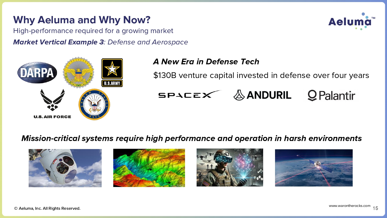 Why Aeluma and Why Now? High - performance required for a growing market Market Vertical Example 3 : Defense and Aerospace A New Era in Defense Tech $130B venture capital invested in defense over four years Mission - critical systems require high performance and operation in harsh environments www.warontherocks.com © Aeluma, Inc. All Rights Reserved. 15