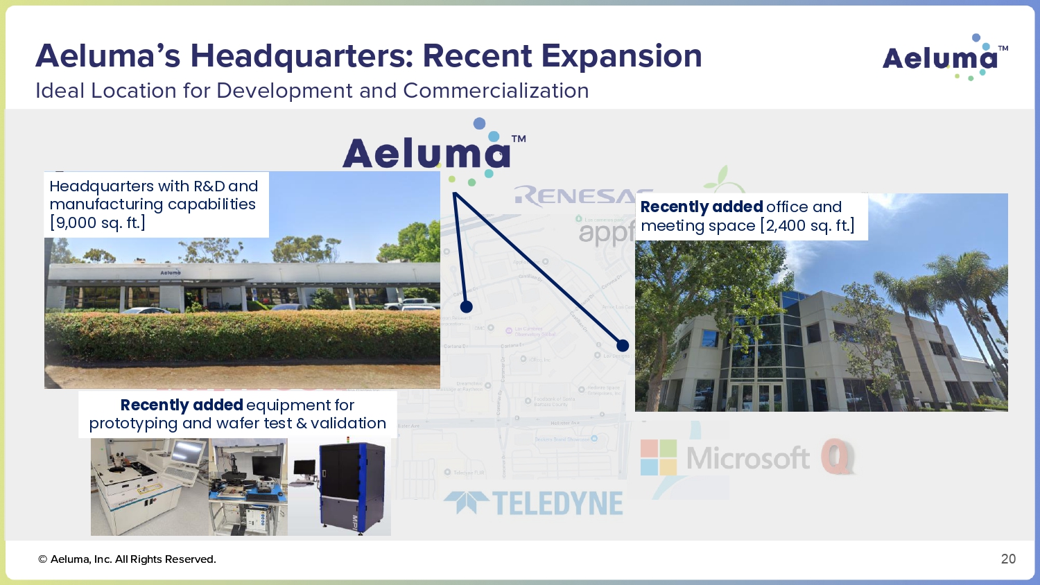Aeluma’s Headquarters Ideal Location for Development and Commercialization Headquarters with R&D and manufacturing capabilities [ 9 , 000 sq . ft . ] © Aeluma, Inc. All Rights Reserved. 19