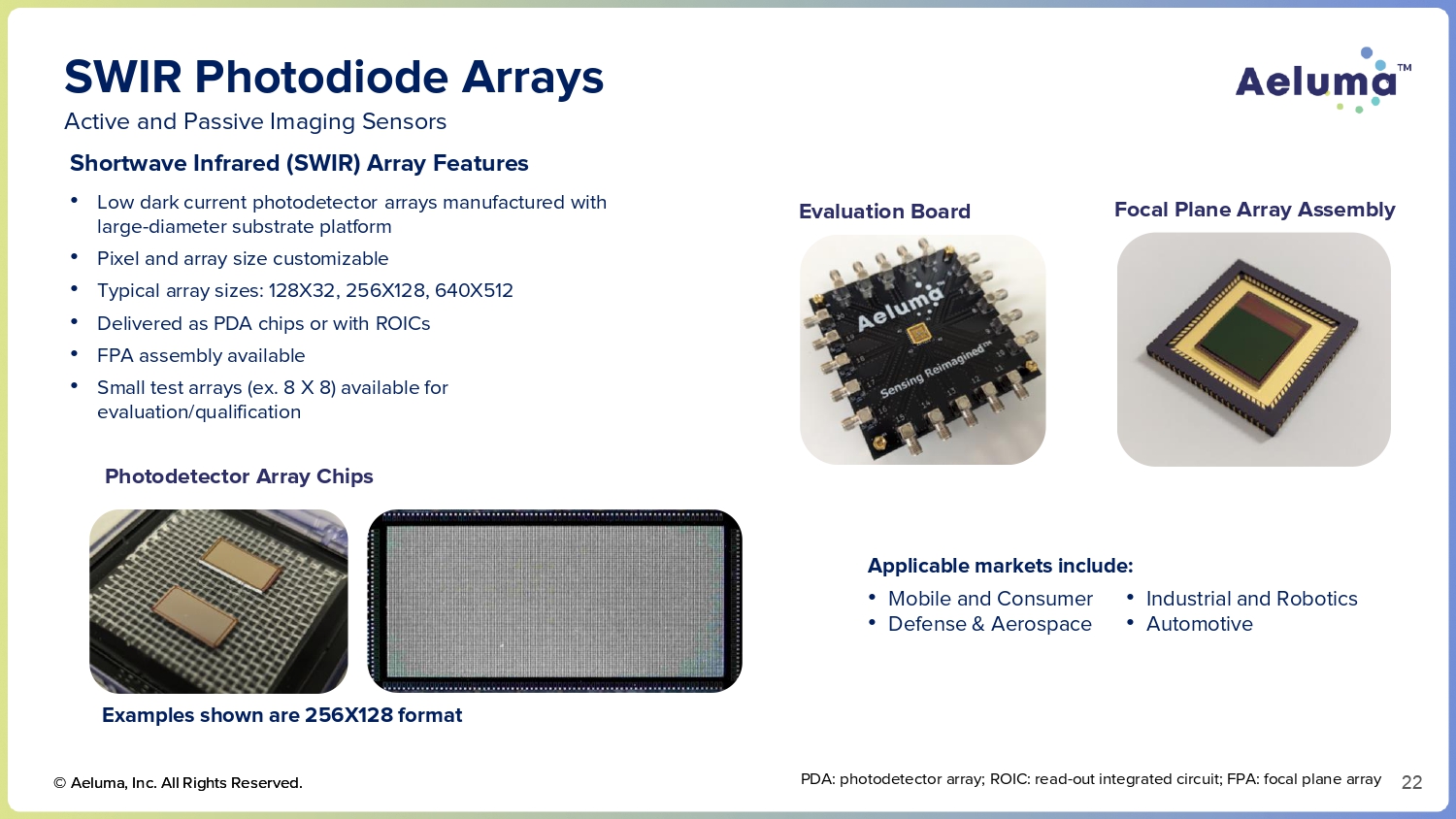Technology Portfolio © Aeluma, Inc. All Rights Reserved. 21 Near - Term Focus • Detector Arrays • Large - area Detectors • High - speed Detectors • Quantum Dot Lasers • Templates Longer Term • QD Lasers in Silicon Photonics • Quantum Photonics • Nano - scale Semiconductors