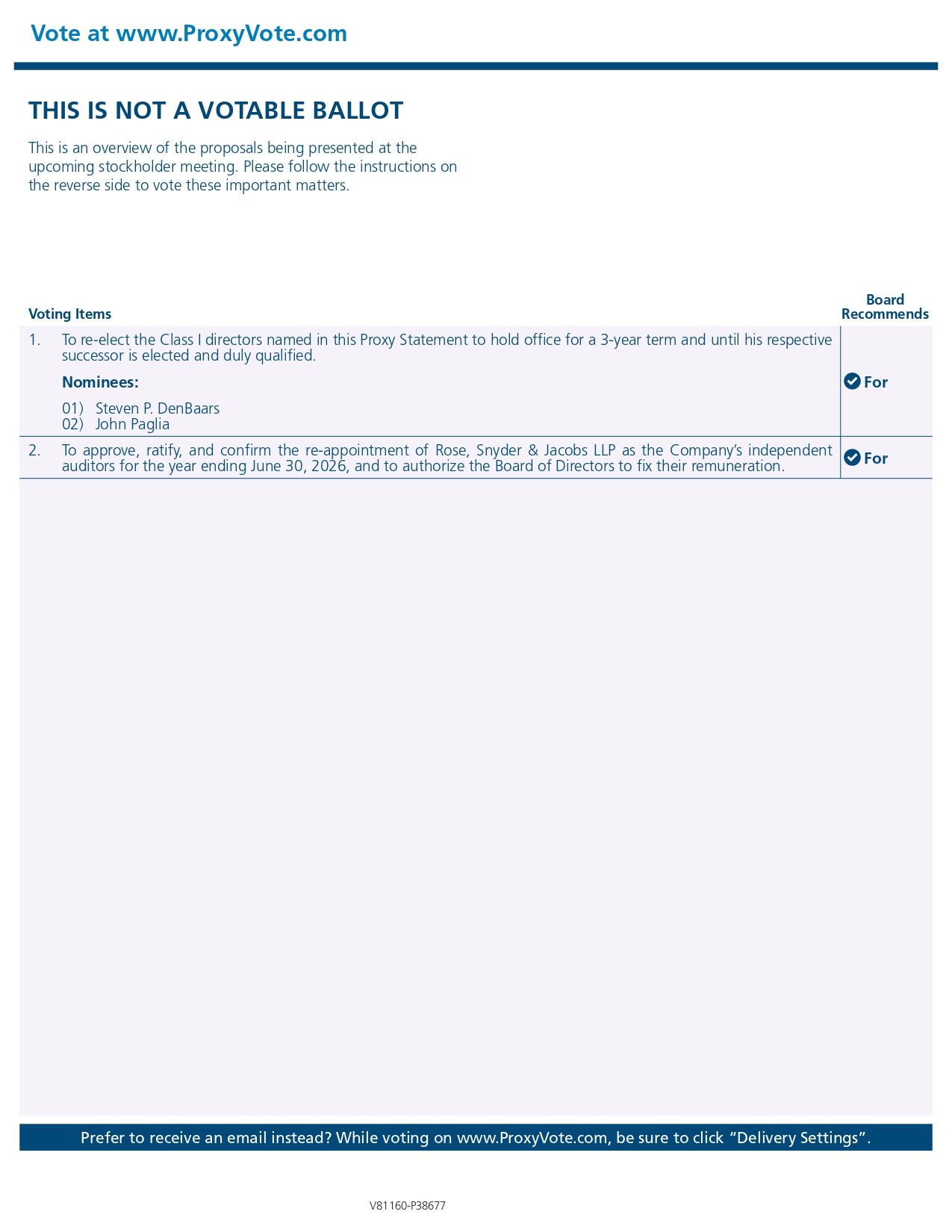 Vote at www.ProxyVote.com THIS IS NOT A VOTABLE BALLOT This is an overview of the proposals being presented at the upcoming stockholder meeting. Please follow the instructions on the reverse side to vote these important matters. Prefer to receive an email instead? While voting on www.ProxyVote.com, be sure to click “Delivery Settings”. For 1. To re - elect the Class I directors named in this Proxy Statement to hold office for a 3 - year term and until his respective successor is elected and duly qualified. Nominees: 1) Steven P. DenBaars 2) John Paglia For 2. To approve, ratify, and confirm the re - appointment of Rose, Snyder & Jacobs LLP as the Company’s independent auditors for the year ending June 30, 2026, and to authorize the Board of Directors to fix their remuneration. Voting Items Board Recommends V81160 - P38677